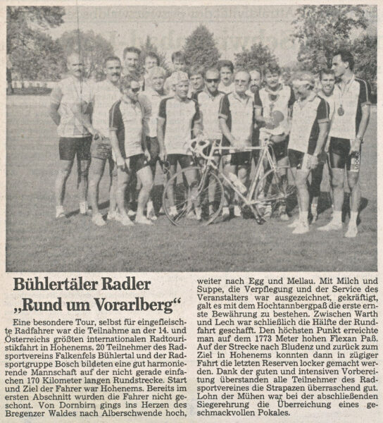Eine besondere Tour, selbst für eingefleischte Radfahrer war die Teilnahme an der 14. und Österreichs größten internationalen Radtouristikfahrt in Hohenems, 20 Teilnehmer des Radsportvereins Falkenfels Bühlertal und der Radsportgruppe Bosch bildeten eine gut harmonierende Mannschaft auf! der nicht gerade einfachen 170 Kilometer langen Rundstrecke. Start und Ziel der Fahrer war Hohenems.