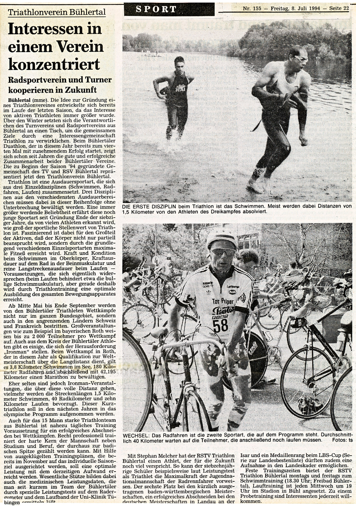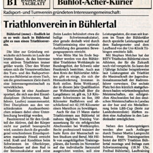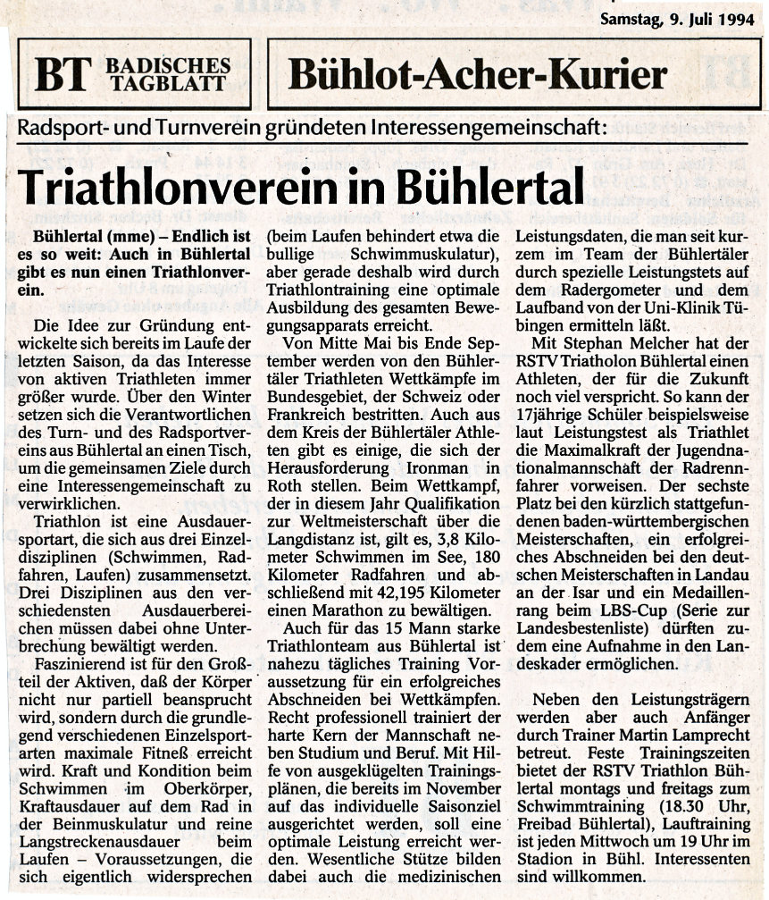 Die Idee zur Gründung eines solchen Vereines entwickelte sich bereits im Laufe der letzten Saison, da das Interesse von aktiven Triathleten immer größer wurde. Über den Winter setzten sich die Verantwortlichen des Turnvereins und Radsportvereins aus Bühlertal an einen Tisch, um die gemeinsamen Ziele durch eine Interessengemeinschaft Triathlon zu verwirklichen. Beim Bühlertäler Duathlon, der in diesem Jahr bereits zum vierten Mal mit zunehmendem Erfolg stattfand, zeigt sich schon seit Jahren die gute und erfolgreiche Zusammenarbeit beider Bühlertäler Vereine. Die zu Beginn der Saison ‘94 gegründete Gemeinschaft des TV und RSV Bünhlertal repräsentiert jetzt den Triathlonverein Bühlertal.