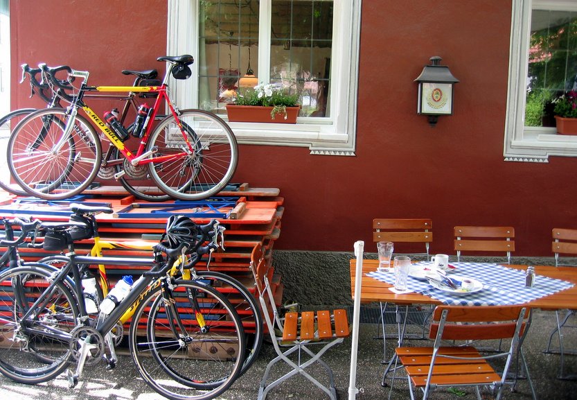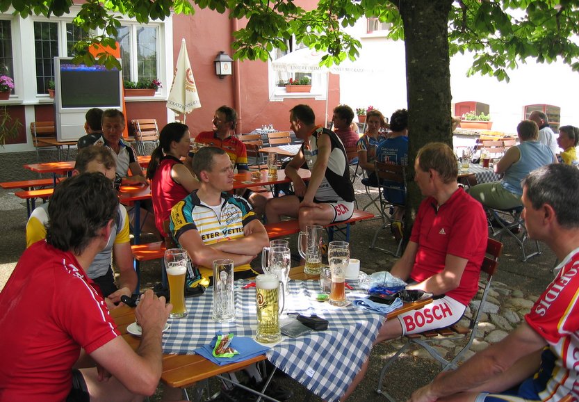 Bei Weiler i. Allgäu haben wir uns verfahren, bei dem es Gerd nach einem bis zu 14%-tigen Aufstieg die letzten Körner kostete. Die Gruppe verabschiedete sich auf die letzten 30km Richtung Immenstadt. Rainer erbarmte sich mit mir im 2er Gruppeto das letzte Teilstück zu bewältigen. Rainer war für mich eine gute Zugmaschine. Und siehe da, wir hatten schon das erste Tannenzäpfle getrunken, bis das Hauptfeld am Hotel Krone in Immenstadt eintraf.