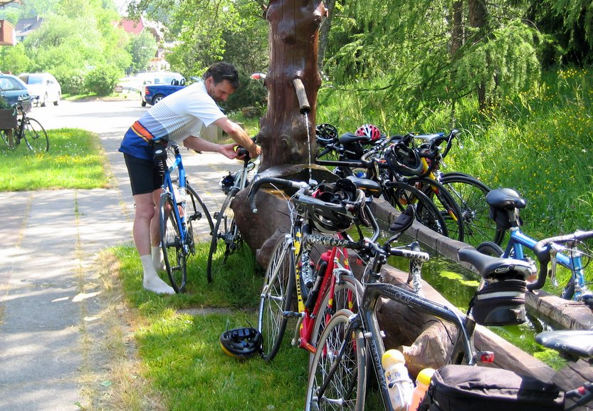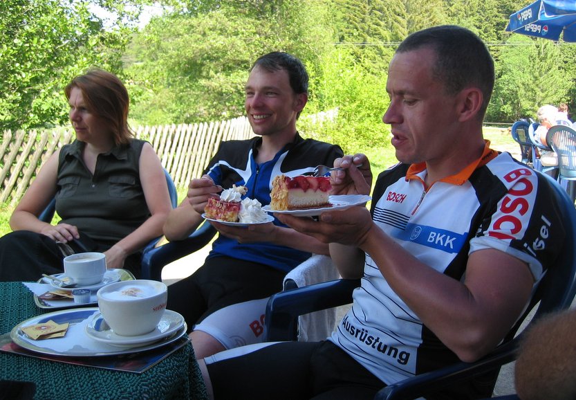 Die Abfahrt Richtung Bleibach wurde im Karacho genommen, selbst Heike und Michael konnten uns zur Rast am Ende des Tales nicht erblicken. Thomas, alias Magnus, (Anm. d. R. – Thomas ist so lang wie der schwedische Rad-Profi Magnus Backstedt- und wurde deshalb Magnus getauft), musste immer wieder Löcher zufahren, die zumeist einzelne Damen verursachten. Für seine langen „Stelzen“ war dies nie ein Problem, die verbratenen Körner konnten ihm die Mädels leider nicht ersetzen.