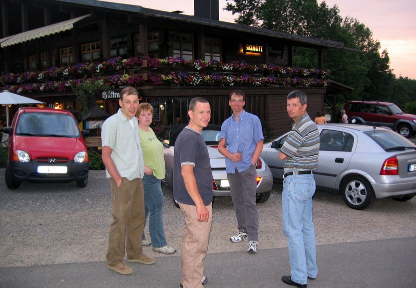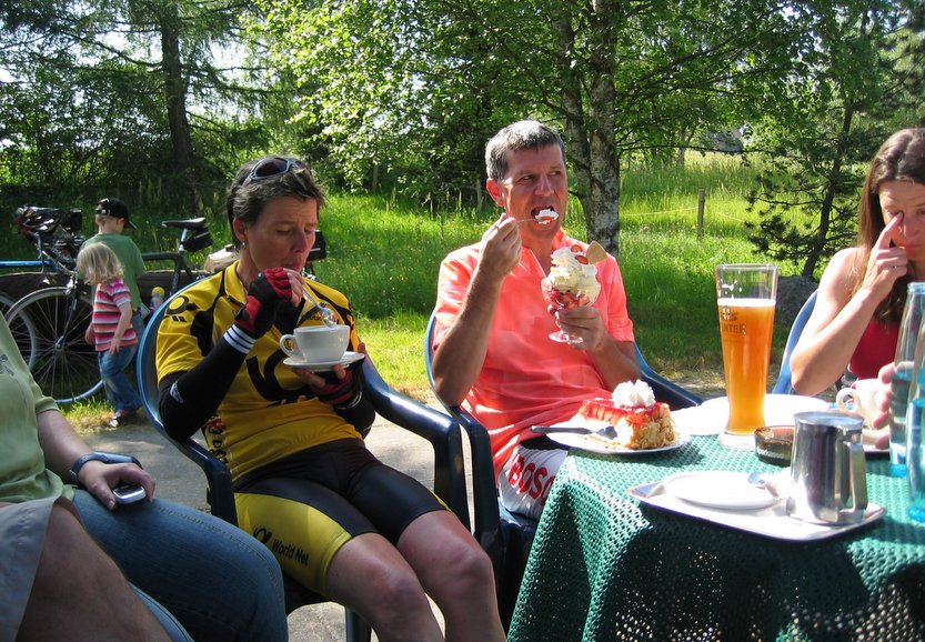 Nachdem wir unser Begleitfahrzeug nach Ortsende Elzach zur Rast bestellten, wurden schon wieder Schlachtpläne für den letzten ernstzunehmenden Anstieg zur Heidburg beredet. Und siehe da: Nach dem ersten Drittel startete Albert mit Kersten, Sven und Matthias, einen überfallartigen Angriff auf den Rest der Gruppe. Das Tempo war so hoch, dass selbst Rolf zusammen mit Gerold im Sattel sitzen bleiben musste. Die Bergwertung Heidburg ging an die Youngsters. Besonders hervorzuheben ist, dass Rolf die gesamten fünf Tage bei den Bergankünften im vorderen Drittel zu finden war. Danach wurde schönes Waldgebiet in Richtung Hofstetten, Haslach absolviert. In Haslach auf dem Marktplatz angelangt, pausierten wir für längere Zeit in einem uns bekannten Café.