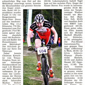 Dabei konnte Christian Kreuchler vom Tempa-Simplon seinen bisherigen Streckenrekord um rd. 1,45 Minuten auf 34:20 Minuten verbessern. Er gewann das Lizenzrennen der Herren vor dem ebenfalls stark fahrenden Markus Siebert vom SC Hausach und Matthias Pfrommer vom Team Haco-Racing.