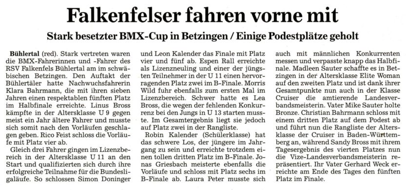 Stark vertreten waren die BMX Fahrerinnen und Fahrer des RSV Falkenfels am vergangenen Wochenende im schwäbischen Betzingen. Dort fanden zum einen der Beginners Cup für die Anfänger sowie die Landesverbandsmeisterschaften für die Lizenzfahrer statt.