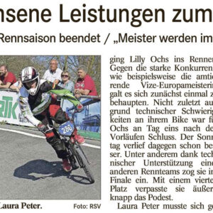 Laura Peter musste sich gegen ein starkes Fahrerfeld in der Klasse Elite weiblich behaupten. An beiden Renntagen kämpfte Sie eisern. Leider war ihre Strategie nicht immer von Erfolg gekrönt. Am Samstag war auch für Peter nach den Vorläufen Schluss. Am Sonntag konnte Sie ihre Performance deutlich steigern, bis sie jedoch im dritten Vorlauf hart zu Boden ging und von den Sanitätern betreut werden musste. Somit war auch am zweiten Renntag der Traum vom Finale ausgeträumt.