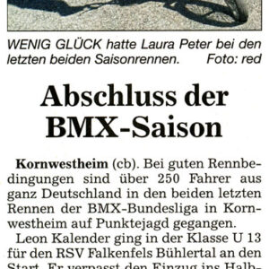 Bei perfekten Rennbedingungen gingen am vergangenen Wochenende über 250 Fahrer aus ganz Deutschland in den beiden letzten Rennen der BMX-Bundesliga auf Punktejagd. Auch Gastfahrer aus Schweden, Österreich und der Schweiz nutzten die Gelegenheit, sich mit ihrer deutschen Konkurrenz zu messen. Vielen der Athleten war anzumerken, dass sich die Saison dem Ende neigt; nicht allen Fahrern fiel es leicht die letzten Kraftreserven zu mobilisieren.