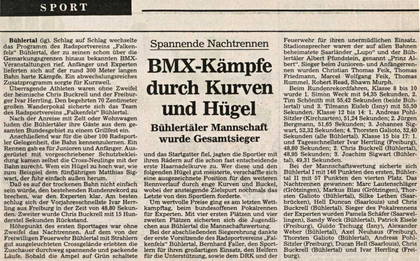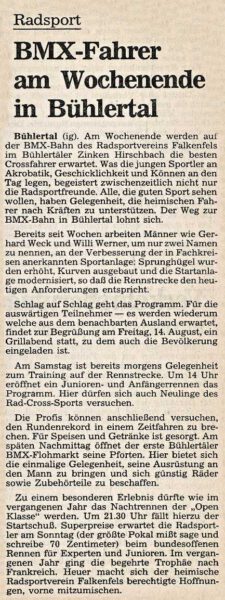 Bühlertal (ig). Schlag auf Schlag wechselte das Programm des Radsportvereins „Falkenfels“ Bühlertal, der zu seinen schon über die Gemarkungsgrenzen hinaus bekannten BMX-Veranstaltungen rief. Anfänger und Experten lieferten sich auf der rund 300 Meter langen Bahn harte Kämpfe. Ein abwechslungsreiches Zusatzprogramm sorgte für Kurzweil.