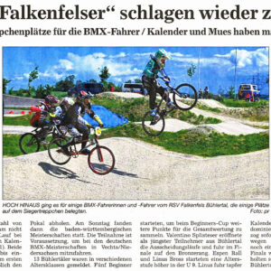 Zum Auftakt des Rennwochenendes in Nussdorf bei Pforzheim trat der RSV Falkenfels Bühlertal mit einer erfolgreichen BMX Gruppe an. Vier Fahrer erreichtem am Samstag beim Beginners und BaWü Cup das Finale. Nach stabilen Vorläufen mit jeweils dem dritten Platz setzte sich Morris Wild in der Altersklasse U11 im Finale mit Platz 4 durch und verpasste somit knapp die Bronzemedaille. In der Altersklasse U9 belegte Espen Rall in jedem Vorlauf den ersten Platz. Aufgrund des großen Teilnehmerfeldes musste er noch zusätzlich ein Viertelfinale überstehen, bei dem er wiederum vorne weg fuhr und den ersten Platz sicherte. Im spannenden Finale erreichte er den dritten Platz und durfte sich über eine weitere Medaille freuen. In der Altersklasse U13 Lizenz musste Robin Kalender gegen eine große Anzahl von Konkurrenten antreten und konnte sich dieses Mal leider nicht bei den Vorläufen durchsetzen, sodass er sich nicht für das Finale qualifizieren konnte. Einen buchstäblichen Siegeszug bei den Lizenzfahrern führten Leon Kalender bei der Altersklasse U9 und Lucas Mues bei U11 durch. Beide blieben vom ersten Vorlauf bis einschließlich Finale vorne auf dem ersten Platz und konnten sich schließlich den Pokal mit der Nummer eins abholen. Sie kontrollierten beide das Feld und fuhren souverän.