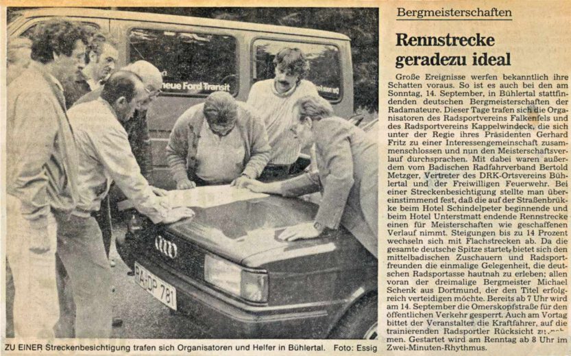 Große Ereignisse werfen bekanntlich ihre Schatten voraus. So ist es auch bei den am Sonntag, 14. September, in Bühlertal stattfindenden deutschen Bergmeisterschaften der Radamateure. Dieser Tage trafen sich die Organisatoren des Radsportvereins Falkenfels und des Radsportvereins Kappelwindeck, die sich unter der Regie ihres Präsidenten Gerhard Fritz zu einer Interessengemeinschaft zusammenschlossen und nun den Meisterschaftsverlauf durchsprachen.