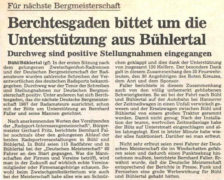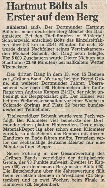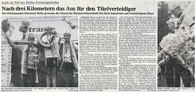 Bühlertal. Mit einem Sieg für den Dortmunder Hartmut Bölts endete auf der Schwarzwaldhochstraße die Deutsche Bergmeisterschaft der Rad-Amateure. Bölts löste mit diesem Sieg den dreifachen Bergmeister Michael Schenk ab, der auch von Hennes Junkermann beim RC Olympia Dortmund betreut wird. Als bester Südbadener kam Ralf Glockner vom RV Bamlach auf den 27. Rang in diesem Einzel-Bergzeitfahren.