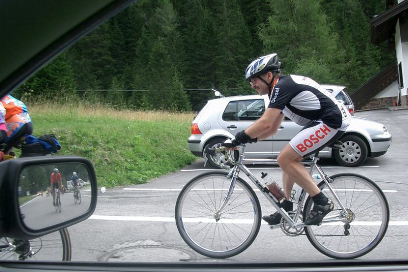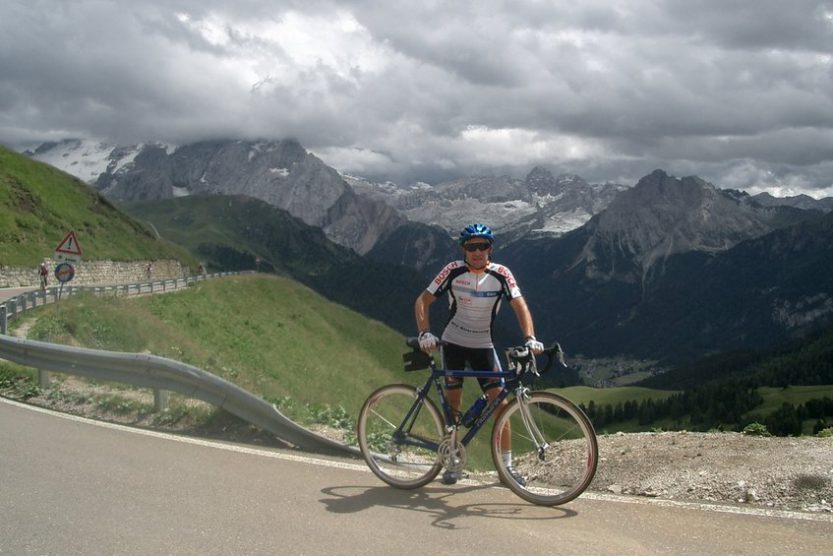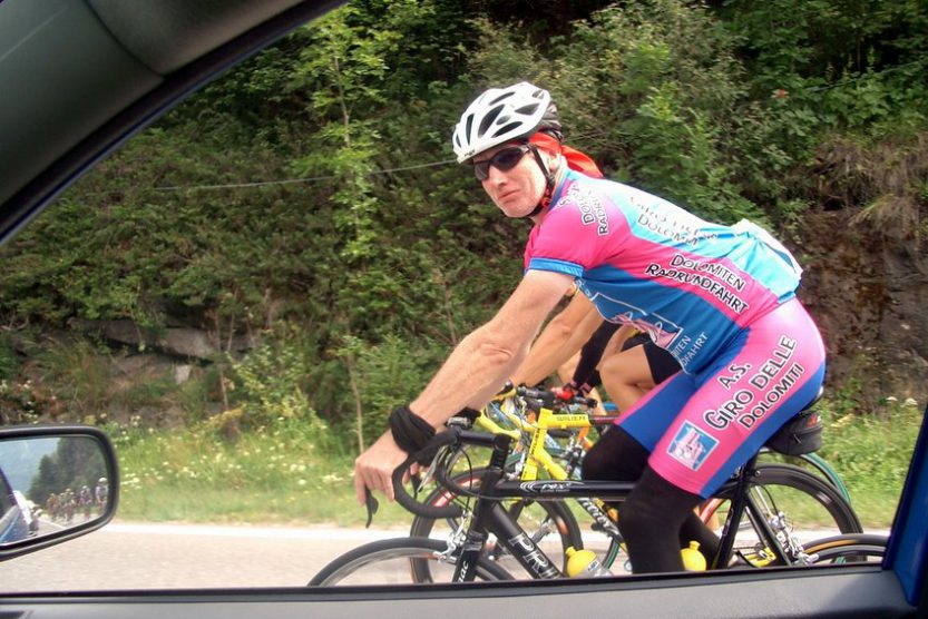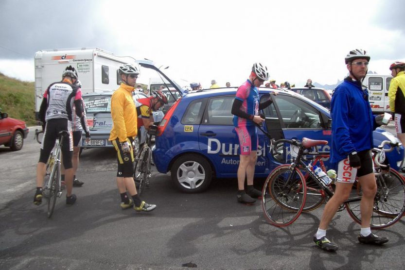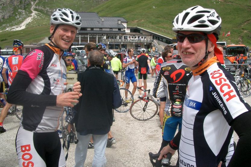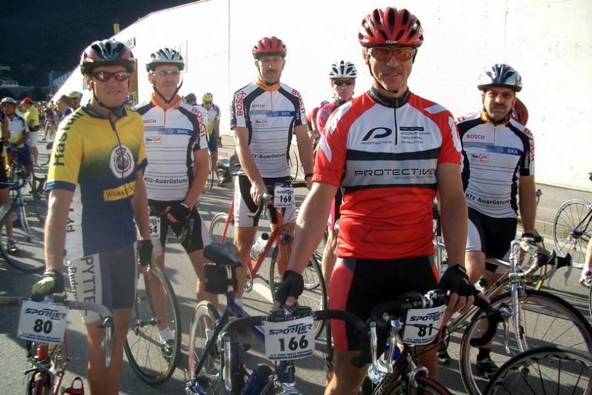 Am Montag, 28. Juli musste von Bozen (266 m.ü.M) aus das Würtz Joch erklommen werden. Über Klausen (530 m.ü.M) und St. Peter Vilnöss (1154 m.ü.M) , wo wiederum die Zeitmessung begann, ging’s auf zwischenzeitlichen Steigungen von 15-16% bis 2002 m.ü.M zum Würtz Joch. Bei der Tour de France wäre das ein Berg der HC (Hors Categorie)! 1738 Höhennmeter auf „einen Rutsch“! Allerdings war die Abfahrt genau so schwierig wie der Aufstieg, weshalb es leider einige Stürze gab.