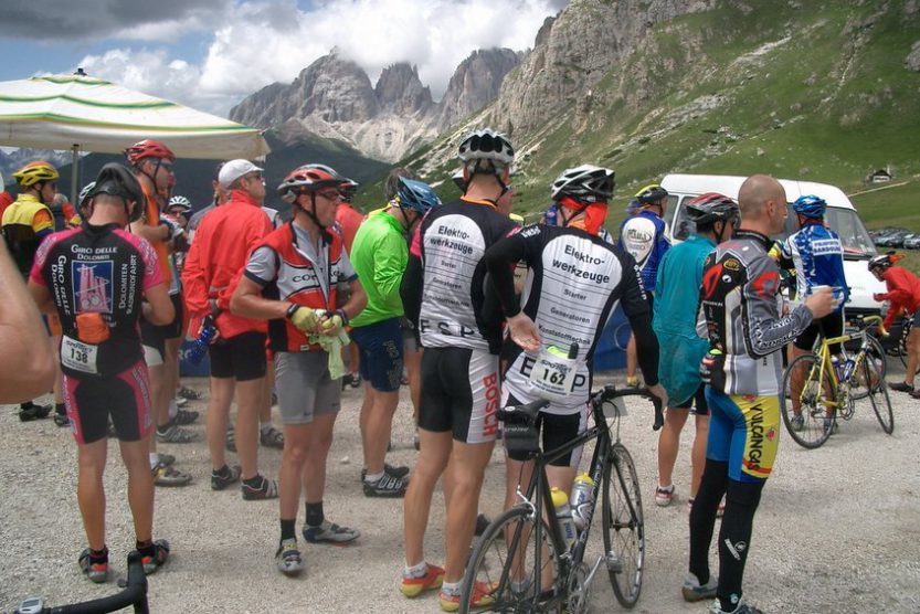 Nachdem nun alle „eingerollt“ waren, stand am Dienstag, 29. Juli die Königsetappe (Sella Ronda“) auf dem Programm. Über St. Ulrich und Wolkenstein warmgefahren, bügelte man das Grödner Joch, den Passo Campalongo, das Pordoi Joch und das Sella Joch einfach glatt! 154 Kilometer und 3.416 Höhenmeter die heutige „Ausbeute“! Ob man was von der wunderschönen Natur mitgekriegt hat?