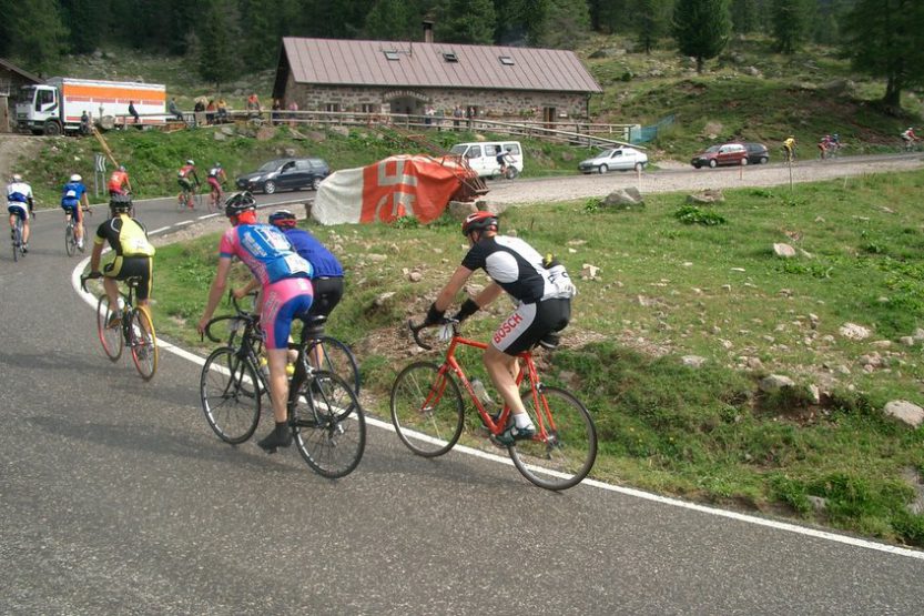 Gleich am Sonntag, 27. Juli, mussten zwei Pässe der ersten und zweiten Kategorie (Passo Mendola oder Mendelpass und der Passo Palade oder Gampen Joch) bezwungen werden. Nach dem Startschuss in Bozen, vorbei am Kalterer See konnte die Landschaft noch genossen werden. Im Mendelpass wurde es bei der Zeitmessung ab km 14 schon richtig „ernst“, da die Zeitmessungen jeder Etappe in die Gesamtwertung eingerechnet werden. Nach dem Gampen Joch und einer schönen Abfahrt über Lana und Meran zurück nach Bozen war die erste Etappe nach 107 Kilometer und 1630 Höhenmeter die richtige Einstimmung.