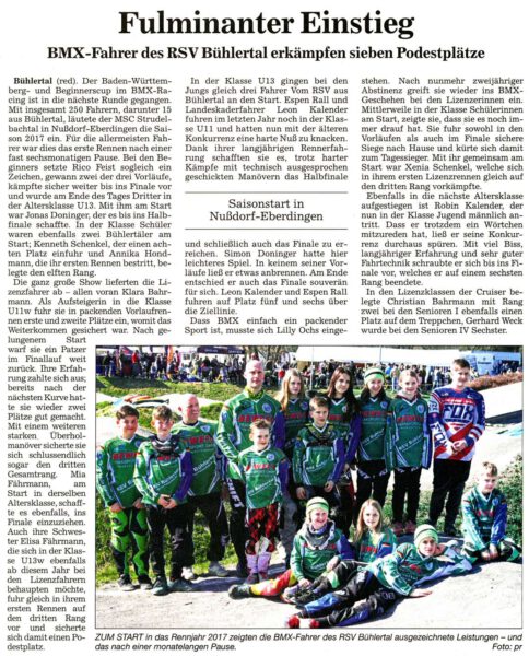 Ein sehr erfolgreicher Auftakt ins BMX-Jahr 2017, welcher eine spannende Saison verspricht, liegt hinter den Fahrern aus Bühlertal. Wer diesen Sport auch gern anschauen und ausprobieren möchte, ist herzlich eingeladen, das Training in Bühlertal zu besuchen. Unter fachkundiger Anleitung trainiert die BMX-Abteilung des RSV Falkenfels immer dienstags und donnerstags ab 17:00 Uhr auf der vereinseigenen Anlage in der Hirschbach in Bühlertal.