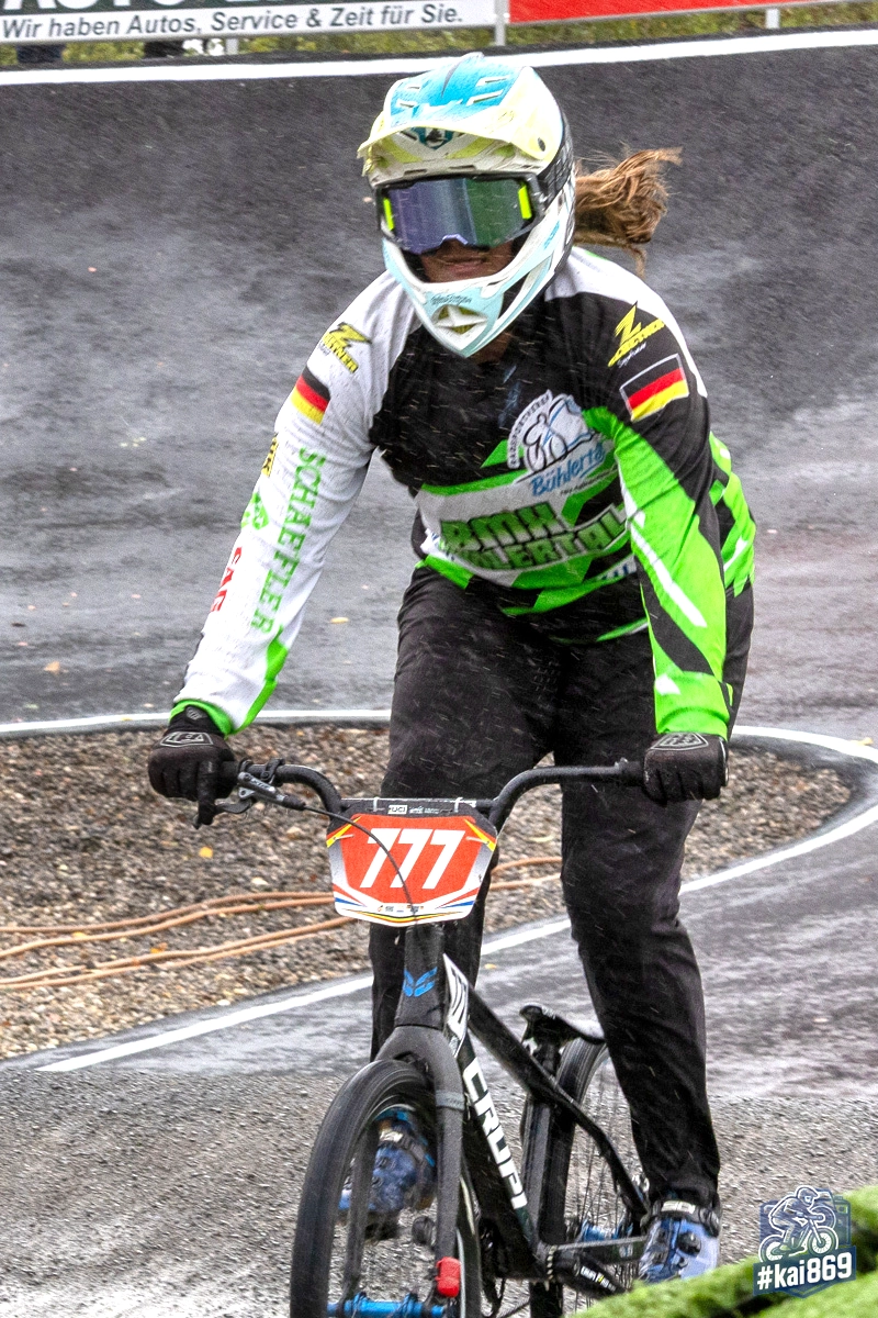 Am Sonntag hofften dann alle auf ein besseres Wetter. Nach einem erfolgreichen Training im Trockenen fing es wieder pünktlich zum Rennstart an zu regnen. Laura startete heute in der Klasse 17+ mit ihrem 20″-Rad. Auch hier hat sie sich in den spannenden Vorläufen für das Halbfinale qualifiziert. Am Ende konnte sie sich über den 16. Platz freuen.
