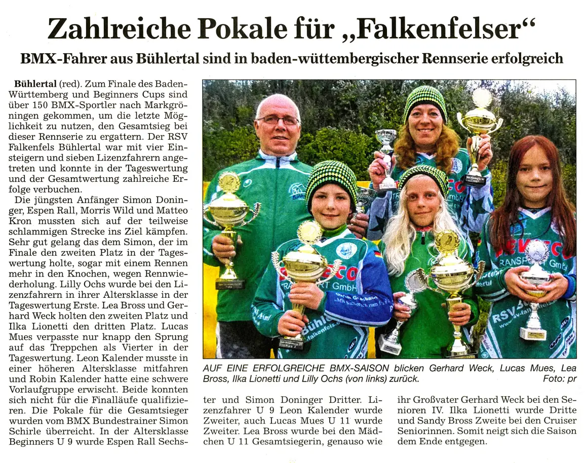 Zum Finale des Baden-Württemberg und Beginners Cups sind über 150 BMX Sportler nach Markgröningen gekommen, um die letzte Möglichkeit zu nutzen, den Gesamtsieg bei dieser Rennserie zu ergattern. Der RSV Falkenfels Bühlertal war mit vier Beginnern und sieben Lizenzfahrern angetreten und konnte in der Tageswertung und der Gesamtwertung zahlreiche Erfolge verbuchen.