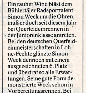Ein rauer Wind bläst dem Bühlertäler Radsporttalent Simon Weck (links) um die Ohren, muss er doch seit diesem Jahr bei Querfeldeinrennen in der Juniorenklasse antreten. Bei den deutschen Querfeldeinmeisterschaften in Lohne-