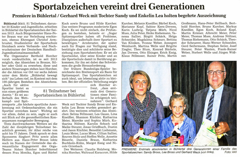 Bühlertal (kkö). 81 Teilnehmer, darunter 20 Kinder und Jugendliche, erhielten in Bühlertal die Sportabzeichen der Saison 2013. Auch Bürgermeister Hans-Peter Braun war zur Verleihung erschienen, ebenso Ehrengast Christof Armbruster, Studienleiter der Sportschule Steinbach sowie Verbands- und Nachwuchstrainer der Deutschen Handball- Jugendnationalmannschaft.