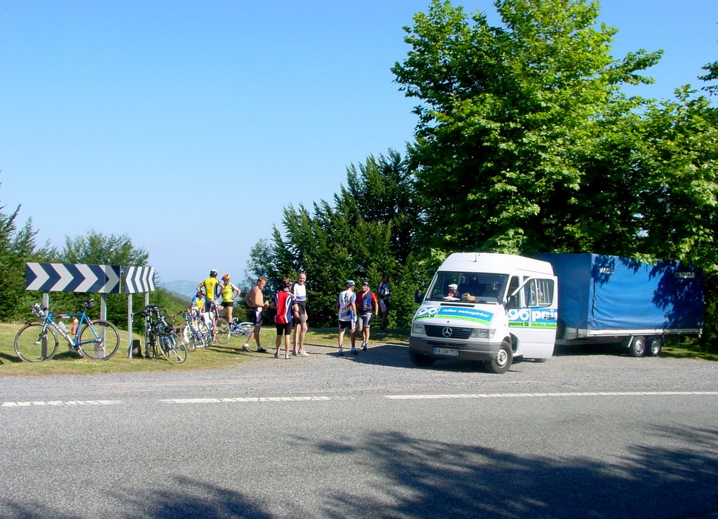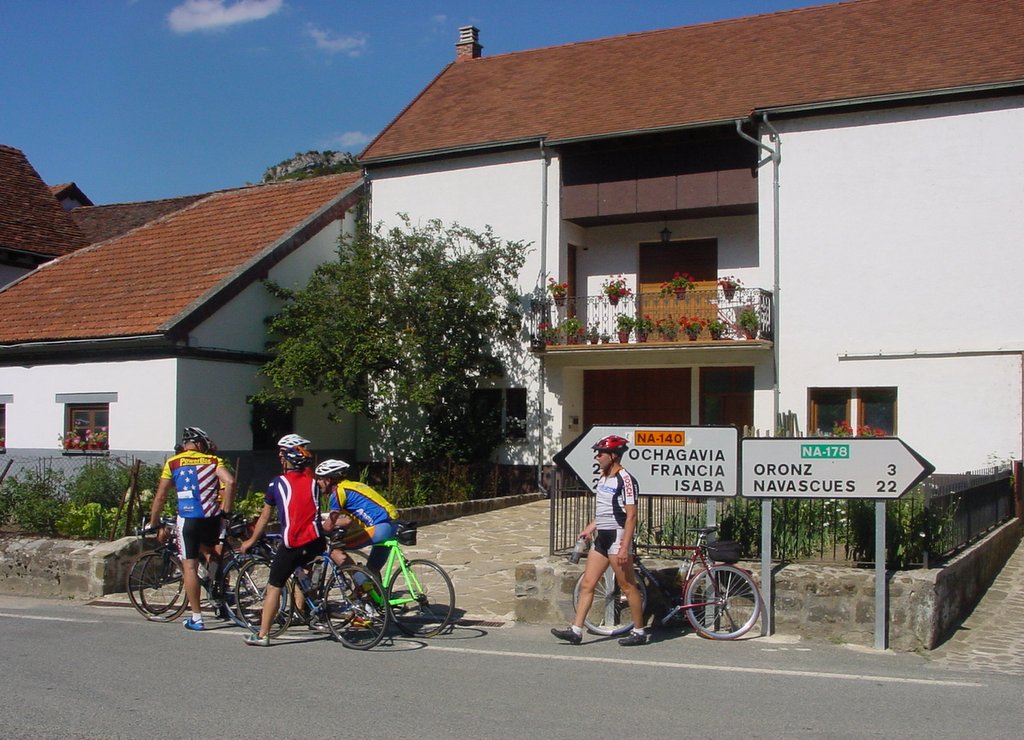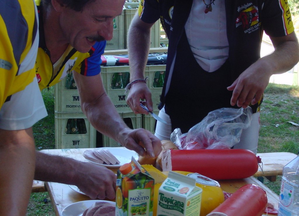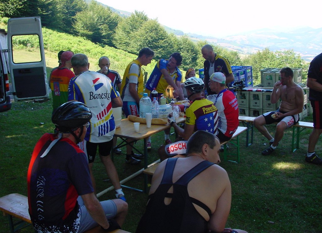 Die Strecke war sehr anspruchsvoll und hügelig, bei hohen Temperaturen – Höchstanzeige meines HAK waren 41 Grad. Am letzten langen und schwierigsten Anstieg zum Ibanete-Pass, versammelte sich die ganze Mannschaft an einem Gebirgsbach, um Abkühlung zu finden. Manche suchten sich im Wald ein ruhiges Plätzchen, um eine andere Linderung voran zu treiben, Rainer hat uneigennützig an seinen Sattel eine Klopapierrolle angebracht………………, für alle Fälle.