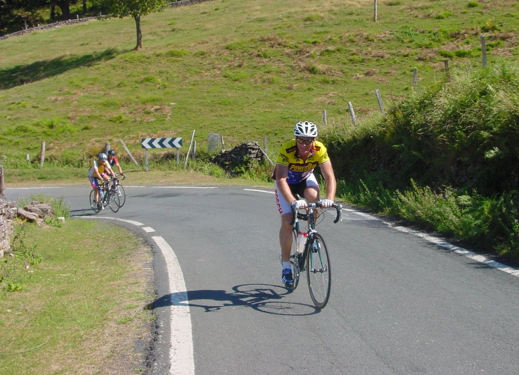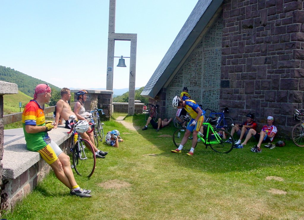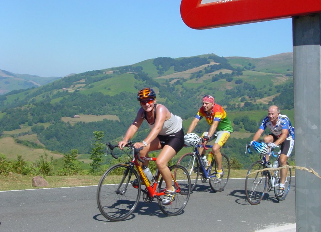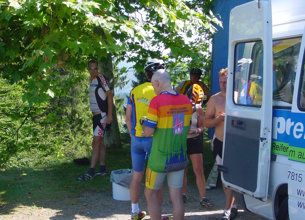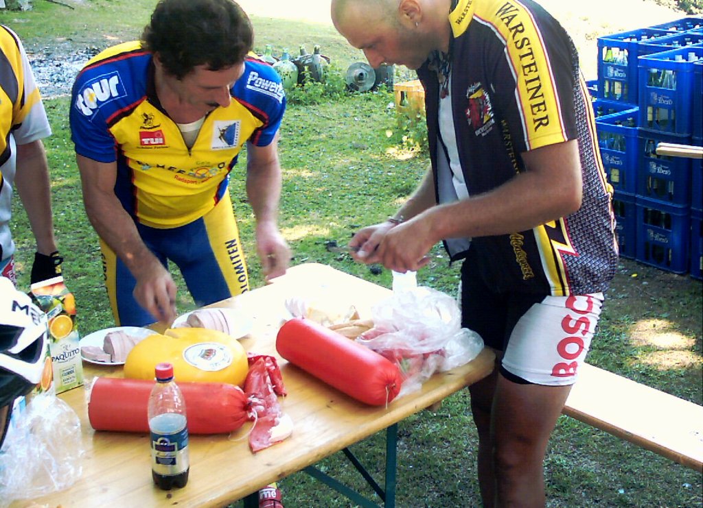 Die Strecke war sehr anspruchsvoll und hügelig, bei hohen Temperaturen – Höchstanzeige meines HAK waren 41 Grad. Am letzten langen und schwierigsten Anstieg zum Ibanete-Pass, versammelte sich die ganze Mannschaft an einem Gebirgsbach, um Abkühlung zu finden. Manche suchten sich im Wald ein ruhiges Plätzchen, um eine andere Linderung voran zu treiben, Rainer hat uneigennützig an seinen Sattel eine Klopapierrolle angebracht………………, für alle Fälle.